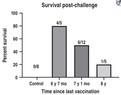Исследование ученых показало, что после однократной иммунизации против бешенства, иммунитет к повторному заражению сохраняется не менее 6 лет, а у некоторых животных до 8 лет. Резюме статьи Dodds WJ, Larson LJ, Christine KL, Schultz RD. Duration of immunity after rabies vaccination in dogs: The Rabies Challenge Fund research study. Can J Vet Res. 2020 Apr;84(2):153-158.