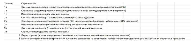 Таблица 1: Уровни доказательности — классификация по терапии/профилактике/этиологии/вреду Источник: Уровни доказательности, Oxford Centre for Evidence-based Medicine, разработано Бобом Филлипсом, Крисом Боллом, Дэйвом Сэкеттом, Дагом Баденоком, Шэрон Страус, Брайаном Хейнсом, Мартином Доусом с ноября 1998 года. Обновлено Джереми Ховиком в марте 2009 года. (https://www.cebm.net/2009/06/oxford-centre-evidence-based-medicine-levels-evidence-march-2009/)