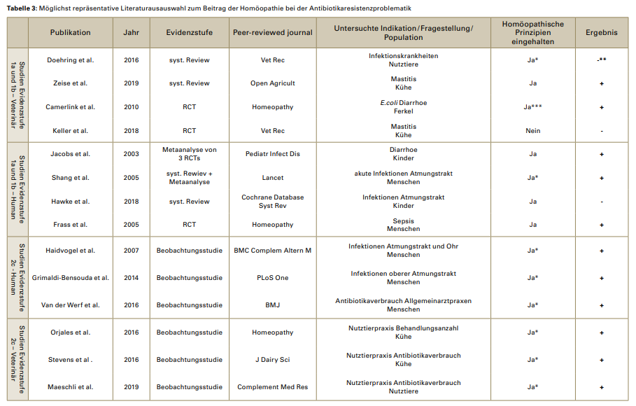 Наиболее репрезентативная подборка литературы о вкладе гомеопатии в решение проблемы антибиотикорезистентности Наряду с результатами экспериментальных исследований, данные из исследований организации медицинской помощи (Versorgungsforschung), изучающих применимость гомеопатии в повседневной практике, указывают на потенциал значительного снижения использования антибиотиков при гомеопатическом лечении. Четыре исследования уровней 1a и 1b по ветеринарно-гомеопатической терапии инфекций В обзоре 2019 года были изучены 32 исследования мастита у коров (с 1982 по 2016 гг.) с применением шкалы качества, учитывающей гомеопатическую методику. На основании восьми наиболее качественных работ был сделан вывод об эффективности гомеопатии (93). Помимо вывода о том, что для лечения/профилактики необходимо выбирать индивидуальное «симиле», одно из исследований показало, что при мастите, вызванном патогенными бактериями вымени, гомеопатия в сочетании с превентивными мерами позволяет снизить применение антибиотиков на 75% (93, 63). В двойном слепом РКИ 2010 года по лечению диареи у поросят, вызванной E. coli, было показано, что в гомеопатической группе заболело значительно меньше животных, чем в группе плацебо (p < 0,0001 на индивидуальном уровне; p = 0,0024 на групповом) (12). Кроме того, тяжесть заболевания была ниже, а длительность диареи — короче (12). В РКИ 2018 года, посвященном гомеопатической альтернативе антибиотикам при маститах, авторы подчеркивают необходимость соблюдения принципов классической гомеопатии для успеха терапии, проведения регулярных осмотров и использования гомеопатии как начального этапа лечения до получения результатов антибиотикограммы (46). Четыре исследования уровней 1a и 1b по гомеопатической терапии инфекций у человека В обзоре 2005 года анализ подгруппы из восьми РКИ по острым инфекциям дыхательных путей подтвердил эффективность гомеопатии (OR = 0,36; CI = 0,26–0,5), независимо от качества исследований (77). Эффективность гомеопатии при сепсисе изучалась в 2005 году (29). 70 пациентов в отделении интенсивной терапии получали гомеопатию или плацебо в дополнение к стандарту. На 180-й день выживаемость в гомеопатической группе была статистически значимо выше (p = 0,043) (29). Швейцарский отчет HTA (2006) идентифицировал 29 исследований (5062 пациента) по инфекциям верхних дыхательных путей и аллергиям с общим положительным результатом для гомеопатии (3). Три исследования уровня 2c по гомеопатической терапии инфекций у человека Наблюдательное исследование 2014 года показало, что пациенты, выбравшие врача с гомеопатическим образованием, получали значительно меньше антибиотиков (OR = 0,43) и жаропонижающих средств (OR = 0,53) при равной эффективности лечения (32). В Великобритании (2016 г.) у врачей общей практики с гомеопатическим образованием частота назначения антибиотиков была на 22% ниже (RR = 0,78) (81). Три исследования уровня 2c по ветеринарно-гомеопатической терапии инфекций В Швейцарии (проект Kometian, 2019 г.) при преимущественном гомеопатическом сопровождении частота применения антибиотиков на предприятиях значимо снизилась с 27 до 18 случаев на 100 животных за первый год (51).