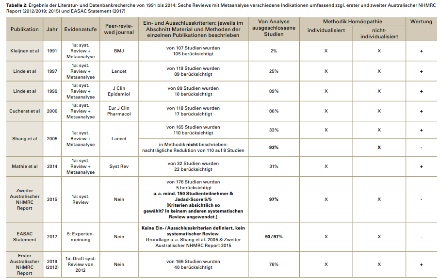 Исследования уровня доказательности 1a по гомеопатии для человека Согласно нашему поиску литературы и баз данных, до 2014 года в области гомеопатии для человека было проведено шесть комплексных метаанализов, учитывающих различные показания. Пять метаанализов пришли к выводу, что эффективность гомеопатической терапии отличается от плацебо, но необходимы дальнейшие методологически высококачественные исследования для окончательных выводов (47, 48, 49, 19, 56). Лишь в одном метаанализе (2005 года) авторы заключили, что гомеопатия не обладает эффективностью, превышающей эффект плацебо (77). Стоит отметить, что в обзоре с метаанализом 2005 года критерии включения и исключения были изменены уже в процессе работы, что изменило оценку с положительной на отрицательную (30). Следующий обзор (Таблица 2) показывает, в частности, сколько исследований было исключено из каждого анализа и изучалась ли индивидуализированная или неиндивидуализированная гомеопатия. Также следует упомянуть три публикации, вышедшие после 2015 года и не опубликованные ни в одном рецензируемом (peer-reviewed) журнале: второй (2015 г.) и первый (подготовлен в 2012 г., опубликован в 2019 г.) отчеты австралийского NHMRC, а также заявление EASAC (2017 г.) (65, 18, 25). В то время как первый отчет австралийского NHMRC, который изначально держался в секрете, дал положительную оценку гомеопатии как минимум по пяти показаниям (включая инфекции верхних дыхательных путей и средний отит, что актуально для проблемы антибиотикорезистентности), опубликованный в 2015 году второй отчет NHMRC сообщил об отрицательном результате (18, 65). Заявление EASAC 2017 года, которое из шести упомянутых метаанализов учло только работу 2005 года и второй отчет австралийского NHMRC (и, следовательно, без указания причин проигнорировало метаанализ 2014 года), также приходит к отрицательному результату (25, 47, 48, 49, 19, 56, 77, 65). Предметом дискуссии является вопрос, насколько корректно оценивать эти работы по критериям доказательной медицины (EbM), учитывая отсутствие рецензирования, использование необычных, преднамеренно выбранных критериев включения во втором отчете NHMRC и селективность ссылок в заявлении EASAC (65, 25). Для оценки качества исследований в метаанализах РКИ оценивается внутренняя валидность. В различных перечисленных метаанализах использовались разные инструменты: шкала Джадада (Jadad Score, ныне устаревшая), а также собственные шкалы для оценки внутренней валидности (47, 48, 49, 19). В обзоре 2005 года качество оценивалось по критериям, схожим со шкалой Джадада (77). В метаанализе Мати (Mathie et al.) 2014 года, как и в более поздних работах 2017, 2018, 2019 годов (они не включены в таблицу, но кратко обсуждаются ниже), использовался современный инструмент Кокрейна (Cochrane tool), дополненный дифференцированной классификацией категорий систематической ошибки (Bias) (56, 58, 59, 57). Программа обзоров Мати (2014, 2017, 2018 и 2019 гг.) существенно отличается от более ранних работ (56, 58, 59, 57). Все четыре обзора также охватывают различные показания, однако в них проводится различие по гомеопатической методике (индивидуализированная или нет) и по группе сравнения (плацебо или иное вмешательство). Метаанализ 2014 года подтвердил эффективность индивидуализированной гомеопатии по сравнению с плацебо (56). Было показано, что гомеопатические препараты, назначенные в рамках индивидуализированного подхода, обладают 