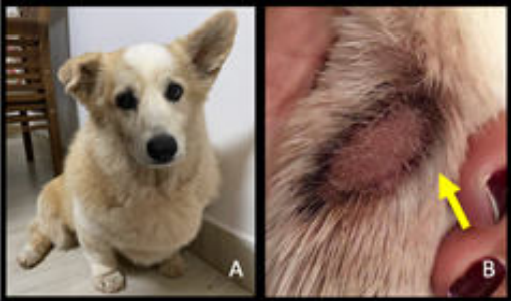 Введение Этиология подобных поведенческих изменений в ветеринарии пока ещё далека от понимания, но известно, что она напрямую связана с поведением владельцев и постоянным изменением их привычного распорядка. В этой области тревога разлуки становится всё более серьёзной проблемой в ветеринарной практике. Её сложно лечить в условиях современного образа жизни, когда у владельцев практически нет четкого распорядка. Расстройство поведения или стереотипное поведение становятся очевидными, когда животное демонстрирует постоянное повторение одного и того же жеста или модели поведения, и эти действия воспринимаются владельцем как ненормальные (Wilkinson & Harvey, 1997). Поведенческая терапия имеет уникальные аспекты в ветеринарии, начиная с участия владельца в постановке диагноза и назначении лечения и являясь одним из основных терапевтических средств (Pereira, 1996). Она может быть связана или не связана с медикаментозной терапией, которая впоследствии может быть вредна для ветеринарных пациентов из-за, как правило, долгосрочных побочных эффектов. Следовательно, комплементарную терапию следует рассматривать в сочетании с корректировкой ухода со стороны владельцев (Valle & Carvalho, 2022). Гомеопатия – это терапия, направленная на комплексное лечение пациента, как физического, так и психического уровня. Последнее подтверждается эффективностью лечения поведенческих расстройств у собак и кошек (Teixeira, 2008). По мнению Teixeira (2008), гомеопатия может оказывать целенаправленное действие при лечении поведенческих расстройств, модулируя индивидуальную восприимчивость и оценивая эмоциональные и психологические проявления, описанные при экспериментах с лекарственными препаратами у здорового человека. По этой причине гомеопатию следует рассматривать как средство лечения психических расстройств у собак и кошек. Целью данной статьи является описание случая психогенного дерматита у 10-летнего самца корги, страдающего от тревоги разлуки, которого лечили инъекционной гомеопатической терапией и который продемонстрировал отличный ответ на лечение. Рисунок 1. A) 10-летний самец корги, кастрированный. B) Желтая стрелка указывает на начальное поражение кожи (акральный дерматит).