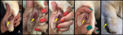 РЕЗУЛЬТАТЫ. Состояние пациента прогрессивно улучшалось после начала лечения (рисунок 2А), уменьшалось вылизывание. Грануляционная ткань образовалась по краям раны (рисунок 2В) через четыре дня после начала лечения. Впоследствии, согласно фотографиям (рисунки 2С и D), улучшение наступало быстро и эффективно. Полное разрешение поражения произошло через 15 дней, а полный рост шерсти на этом месте – через 70 дней (рисунок 2Е). Настоящий владелец пациента вернулся из поездки через 17 дней после появления клинических признаков. Рисунок 2. Желтые стрелки обозначают A) Первичное поражение кожи (акральный дерматит); B) Вид поражения через четыре дня после начала лечения. Грануляционная ткань также отмечена вокруг поражение; C) Вид поражения через семь дней после начала лечения; D) Вид поражения через четыре дня после начала лечения; E) Вид поражения через 70 дней после начала лечения.
