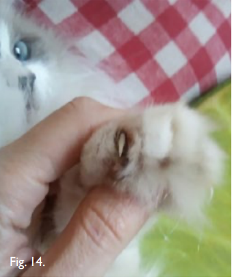 ОТДАЛЕННАЯ ИСТОРИЯ. Она происходит из семьи из 3 человек, которая пережила несколько утрат, в результате чего кошки (кошка была племенной, у нее было несколько беременностей) были заперты на кухне и на балконе, оставлены. Из королевы дома она внезапно оказалась брошенной, и никто ее больше не гладил. Привыкшая к физическому контакту. Урсулу и одну из её дочерей усыновил человек, который хорошо с ними обращался около года. Впоследствии обеих усыновил их нынешний владелец. На момент визита они живут в офисе владельца, где они находятся в её обществе весь день и остаются одни на ночь. По прибытии Урсула сначала сильно чесалась, на носу и ушах у неё образовались струпья. Постепенно ей становилось хуже. Её кормили уткой с горошком. Благодаря диете её тело значительно улучшилось, но НИКОГДА не улучшились пальцы на лапах. После применения гентамицина и перорального приёма кортизона она покрылась струпьями, и с этого момента ей стало хуже. ДРУГИЕ СИМПТОМЫ: Изредка случаются рвота или диарея.